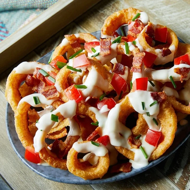 Each bite delivers crispy coating, tender onion, and bold toppings that make this dish irresistibly satisfying. Ideal for sharing or indulging solo, loaded onion rings are perfect as a snack, side, or party favourite.